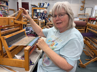 We had a couple of warps cut off of the looms today. Cathy cut off her scarf of mixed fibers including mohair, and Linda cut off her fabric that will be Table Toppers for the upcoming fund raiser. Linda's yarn was a textured yarn for both warp and weft.
