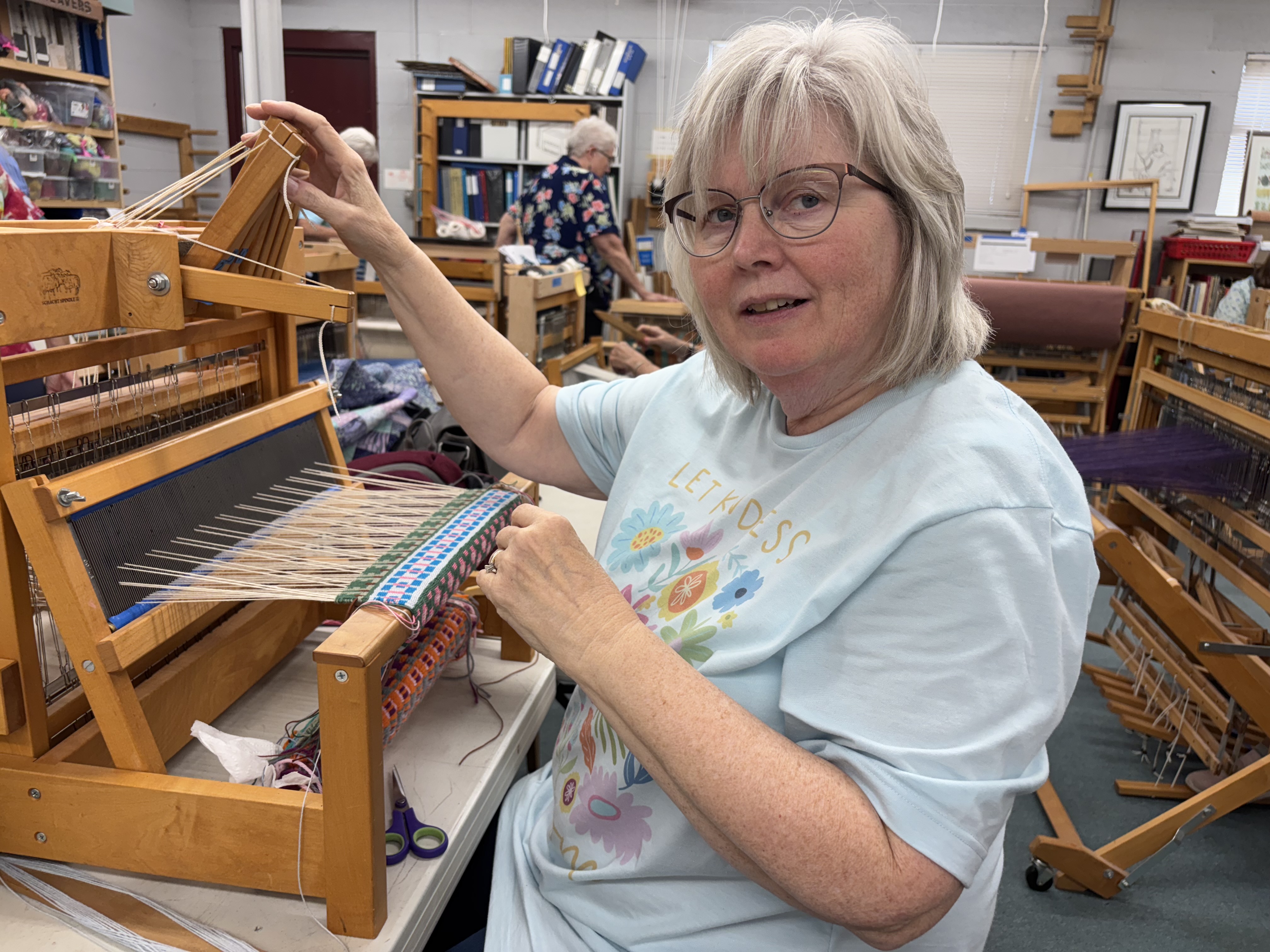 Susan #3 is continuing on her towels. I happened to catch her while she was working on an inlay section that is part of the hem. Susan wove in a larger cord which will be removed when the piece is further along.