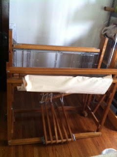 If you're a regular reader of our blog, you know that most of us name our looms for the previous owners, but I think Nancy is a perfect name for this one. It has been at the Center so long, even Carol doesn't remember who donated it. It has its Center tattoo, 11, on its side. Mom bought it from the Center last summer, and bought many replacement parts for it. But she decided it took up too much space in her house and wanted to sell it. I have the parts, an apron and some texsolve tie up cords, and will be putting her back in working order soon.