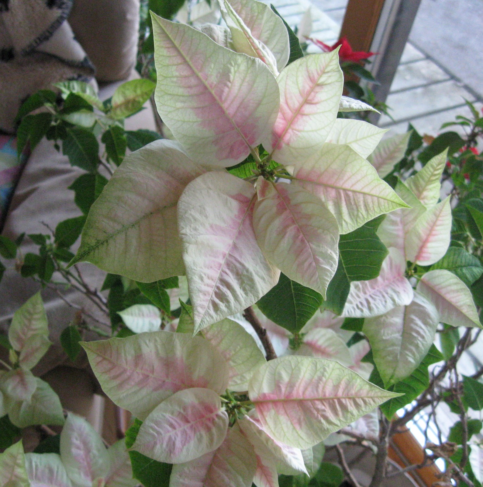 This is a shot of one of my poinsettias that I've had for a few years.  Some folks are very careful about their care, but mine seem to thrive on neglect!  I shove them out the door in the spring...just as soon as the threat of frost is over, and they stay outside all summer until the frost danger returns.  Then, after they drop all their leaves, the new ones return.  This was an especially good year for my plants.  And, this one was outstanding!!!!  They'll be at the sliding glass doors until Spring returns.....and out they'll go again!