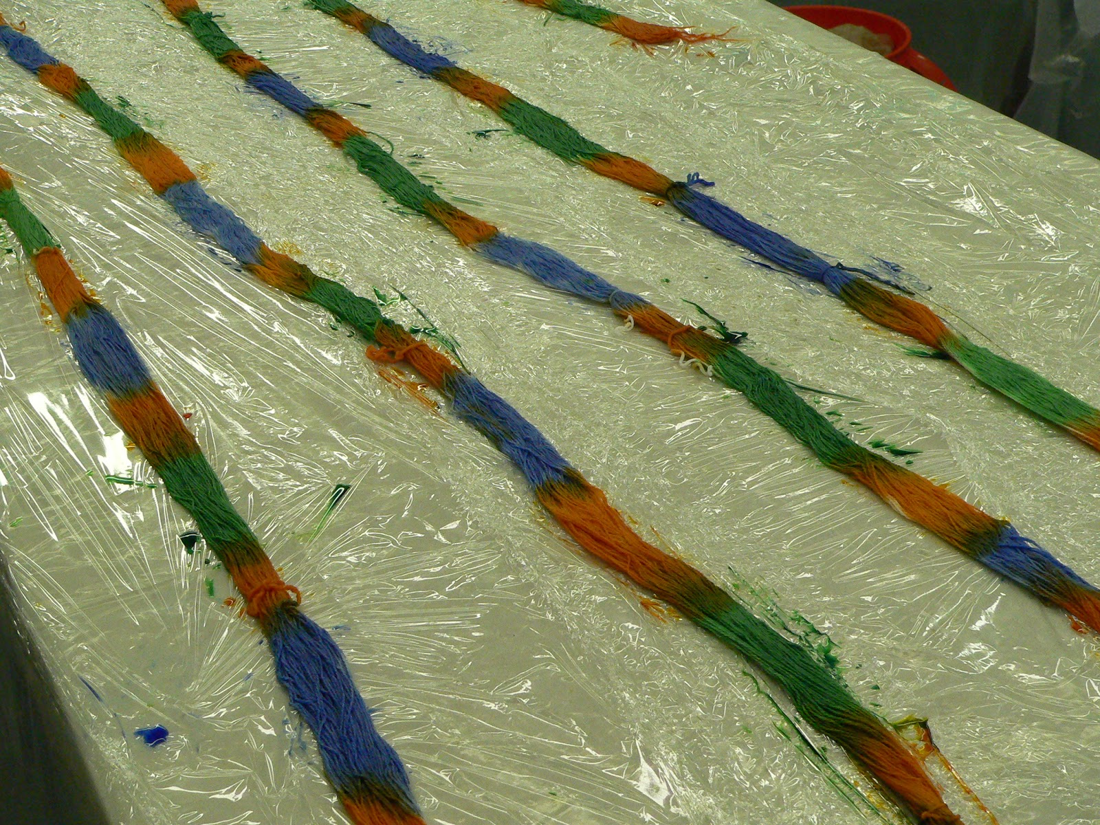 The best tips for dyeing: buy those risers they sell to raise the beds of kids going to college. They saved our backs til about 3pm! when we started groaning. We raised our tables so that we didn't have to bend over them and paint our warps.
