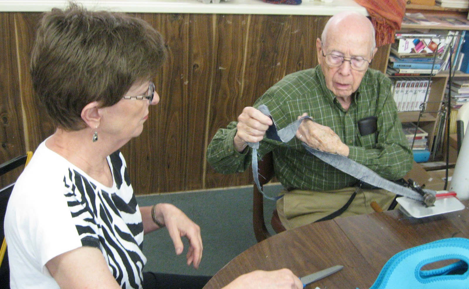 How about some "new" wefts? Carl took some blue jean panels home to join.....now it's time to cut them into strips. Cindy helped to feed the long panels through the rag cutter.