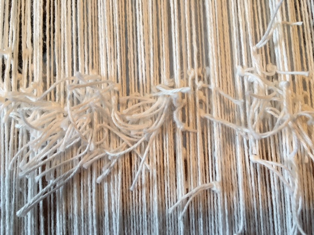 Tina is still hard at work on that mystery warp that was missing the cross. She rough sleyed it in the reed, and is working hard at getting it wound on. Whenever she disappeared from sight, that meant she was adding the weights before she did the winding.