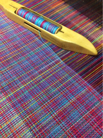 It's just a week and a half til my last show of the season. So, I am weaving a couple more warps to fill in a gap. These are vests. I'm using bits and pieces of leftover balls of painted bamboo for the warp. It's cheerful and happy. Well, I was happy when I wove this warp! Using a skein of turquoise and hot pink/red for the weft, it has a nice plaid look.